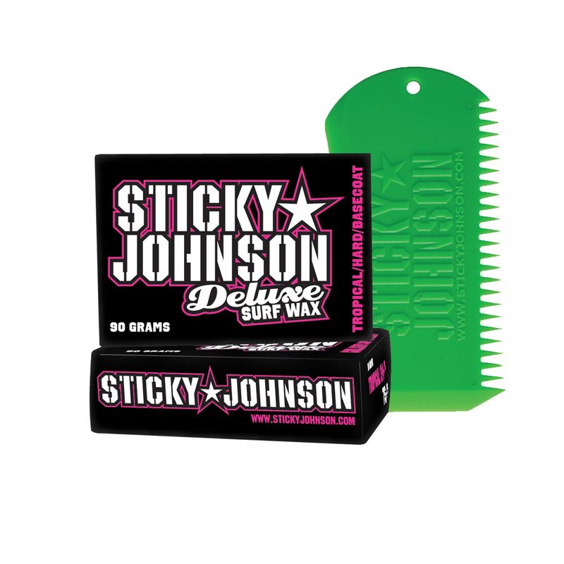 Sticky Johnson Tropical Surf Wax and Comb Combo. Sticky Johnson Surf Wax is a nontoxic product which uses natural ingredients for superior traction. Our Deluxe surf wax has been scientifically engineered to provide a wax which is easy to apply, sticky, long lasting and super grippy!! Sticky Johnsons Deluxe Surf Wax is exported globally and is fastly becoming regarded as one of the best waxes in the world! Grab a block and feel the difference…